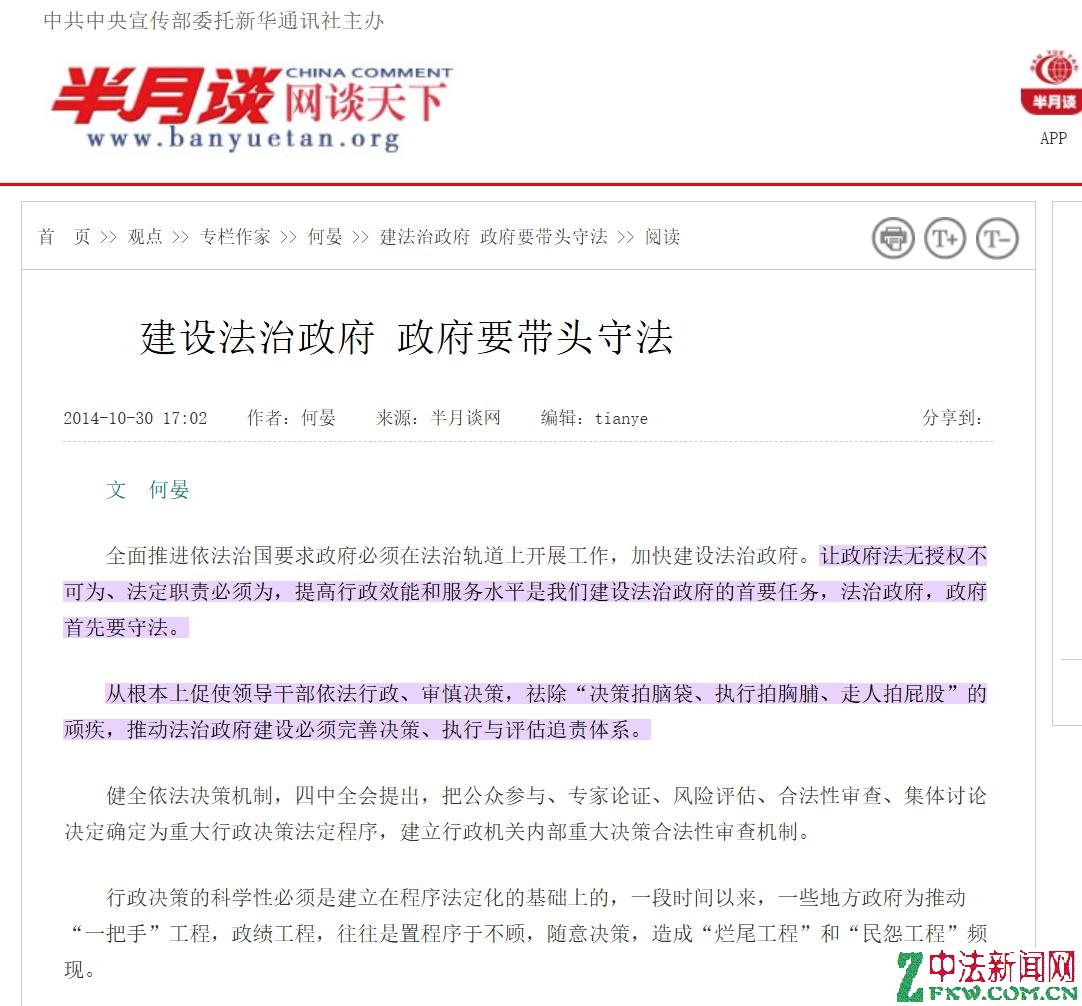 2014年10月《半月谈》杂志即发表了《建设法治政府 政府要带头守法》,文章指出:“让政府法无授权不可为、法定职责必须为,提高行政效能和服务水平是我们建设法治政府的首要任务,法治政府,政府首先要守法。”