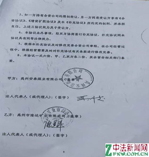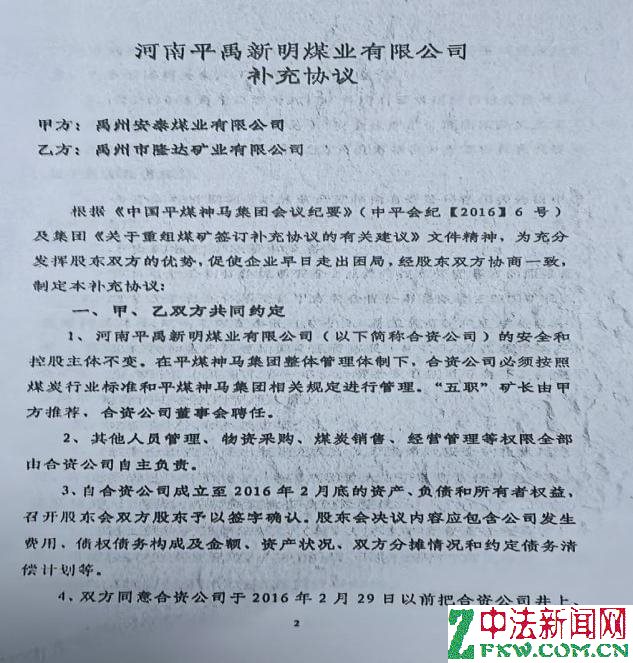 同日,安泰煤业公司和隆达矿业公司也签订了《关于河南平禹新明煤业有限公司补充协议》,明确了前述协议内容及甲方的领导地位。