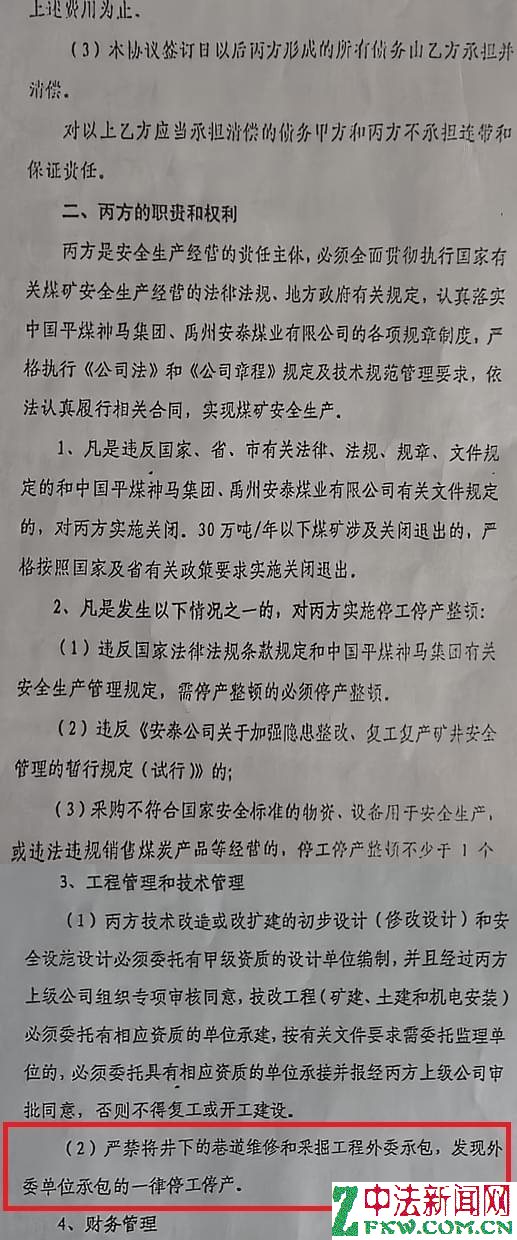 2019年11月13日,甲方安泰煤业、乙方隆达矿业、丙方新明煤业签订的《安全生产经营协议》在丙方的职责和权利中,第三条工程管理和技术管理第2条规定:严禁将井下的巷道维修和采掘工程外委承包,发现外委承包单位承包的一律停工停产。第四条财务管理第1条规定:丙方严格执行国家财政部《企业会计准则》和中国平煤神马集团财务会计制度,建立健全财务机构,依法纳税。丙方劳动用工管理严格按照《劳动法》,《劳动合同法》,中国平煤神马集团和禹州安泰煤业有限公司有关重组煤矿劳动用工管理等相关文件规定用工,丙方需与劳务公司(在中国平煤神马集团备案过的)签订劳务派遣协议,员工与劳务公司签订劳务合同。所有员工统一招录,统一管理,统一使用。严禁使用工程外包队伍和由施工组织垫资的队伍。