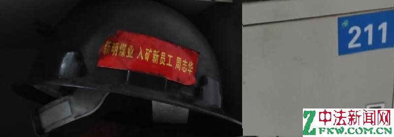 农民工周志华说他培训后有上岗证,但矿方却没有记录,上班多月,也不给发工资。图为周志华的安全帽和柜子。
