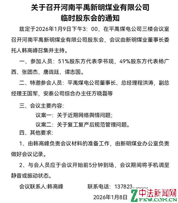 1月9日,新明煤业公司股东会在平禹煤电公司召开,平禹煤电公司董事长程洪涛在会上指出:公司严禁井下采煤队外包,否则一律停工停产。