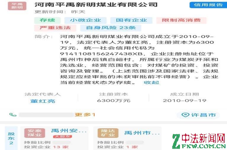 平禹新明煤业成立于2010年9月,是禹州市隆达矿业有限公司(民营,涉多起失信与司法案件)通过兼并重组后,与国有企业平禹煤电公司(后股权转入其全资子公司禹州安泰煤业有限公司)合资成立的企业。股权结构一直为:国企方安泰煤业持股51%,民营方隆达矿业持股49%。