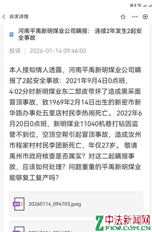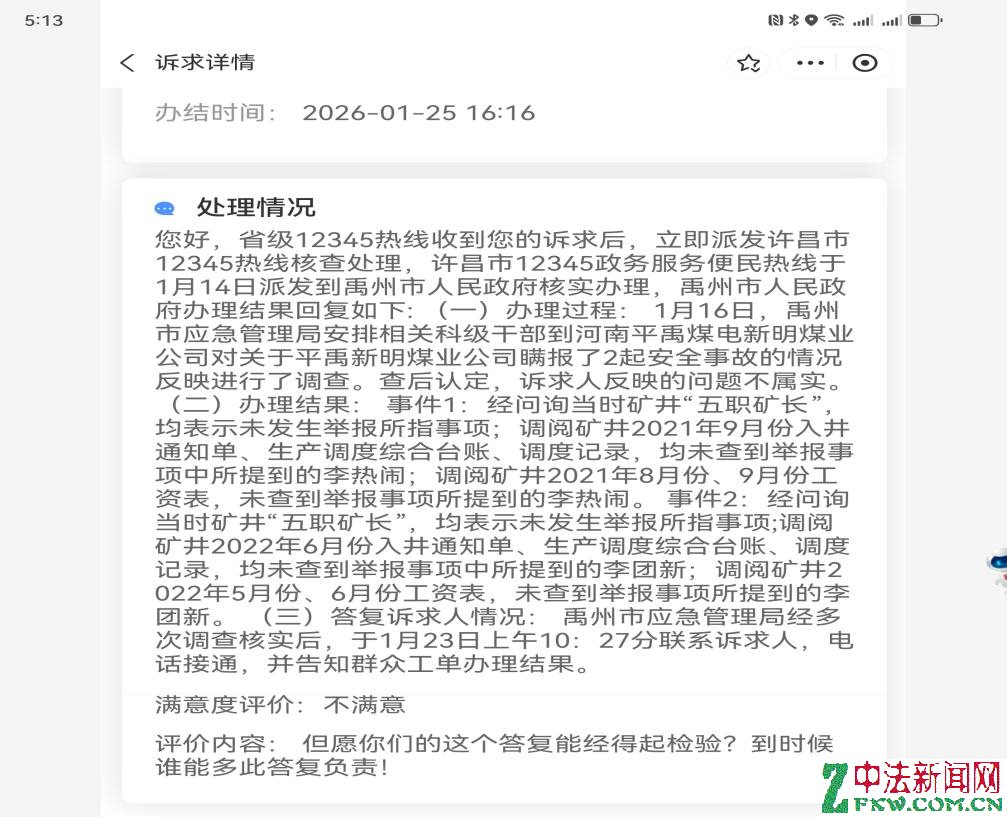1月14日,撰稿人针对平禹新明煤业公司的二起瞒报事故通过豫事办向禹州市田会卿市长进行了反映。