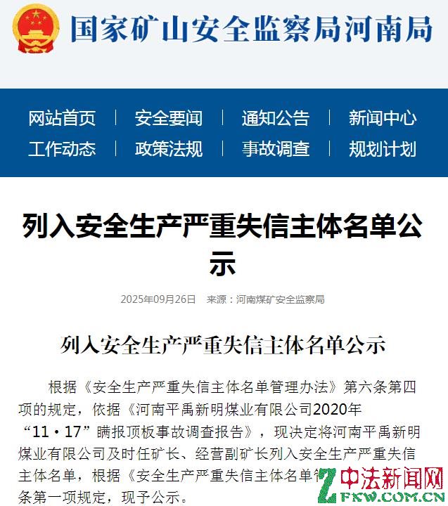 河南平禹新明煤业有限公司2020年“11·17”瞒报顶板事故,河南煤矿安全监察局于今年9月26日决定将河南平禹新明煤业有限公司及时任矿长、经营副矿长列入安全生产严重失信主体名单。