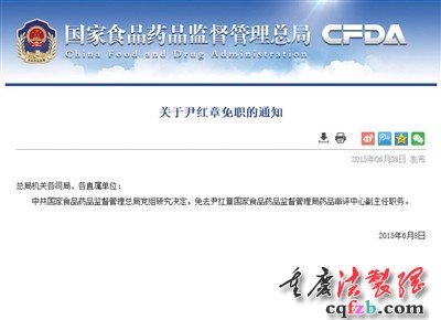 2015年6月,国家食药监总局发布通知,免去尹红章职务。