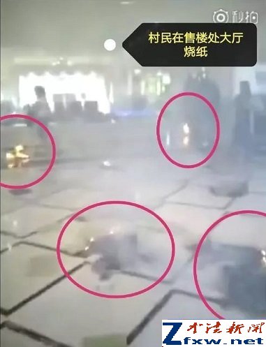 愤怒的村民干脆来售楼大厅里给逝去的先人们上坟,根据现场拍摄的视频看,售楼大厅里到处都是焚烧的纸堆,有的已经烧成了灰烬,还有人正蹲在地上焚烧纸钱,大厅里烟雾缭绕,售楼处的工作人员们呛得纷纷跑了出去。