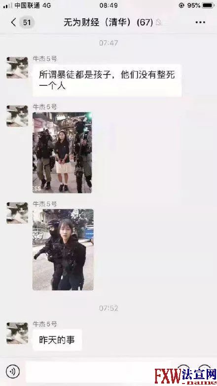 13日,社交媒体上有人爆出一位账号为“牛杰5号”的网友在微信群组中发表涉香港不当言论的多张截图,引发舆论关注。该网友在群组中称“所谓暴徒都是孩子,他们没有整死一个人”。有网友对比表示愤怒。