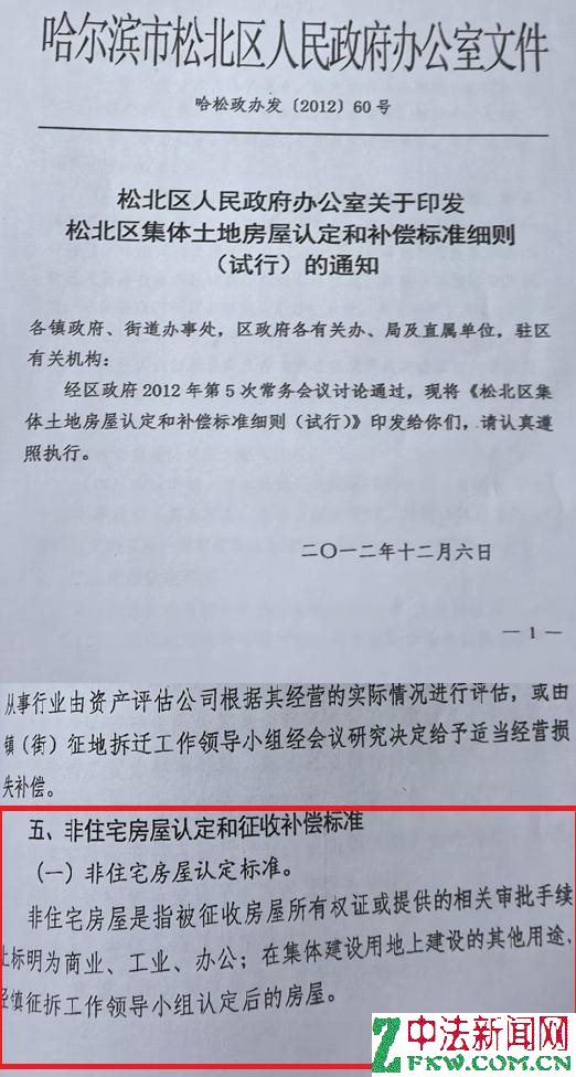 松北区政府60号文件规定非住宅房屋认定标准是“经镇征拆工作领导小组认定”