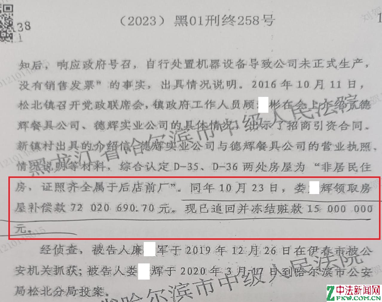 2019年5月松北警方立案,直到2022年12月12日松北区法院才下达黑0109刑初176号刑事判决书(刑终258号刑事裁定书维持原判)认定:廉某军、娄某辉构成诈骗罪故意提交虚假证明材料,误导松北镇政府作出错误认定,发放了7200余万元拆迁补偿款。二人被判诈骗罪获刑15年,并出罚金50万,评估员赵某洋因出具证明文件重大失实罪被判刑1年零5个月。