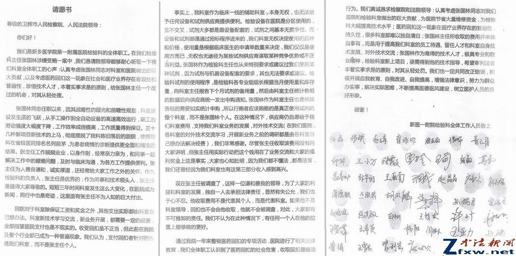 河南新乡医学院第一附属医院检验科室人员的请愿书