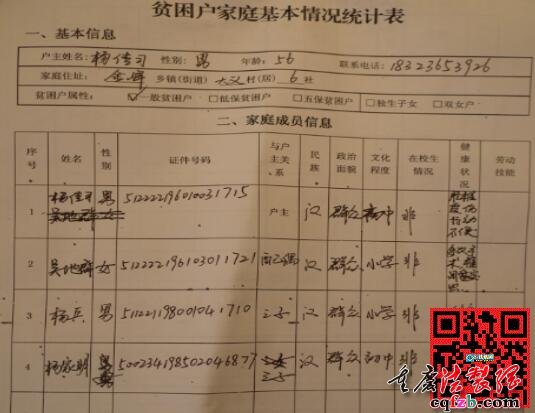 但实际情况是现在还是建档贫困户,家庭只有夫妻二人:因为家贫无法娶媳妇,儿子杨兵便成为别人家的上门女婿,于2016年迁走户口;至于什么杨家明则没有这个人,只有一个1986年出生的女儿叫杨家燕,在重庆上中专时就迁走户口了,此后一直没有迁回。