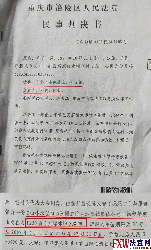 2019年9月10日,重庆市涪陵区人民法院作出(2019)渝0102民初7008号《民事判决书》显示:户籍地为重庆市丰都县高家镇水桶坝村3组的原告毛平,于2019年9月10日向涪陵区法院起诉丰都高家镇太运村3组,请求法院依法确认毛平与太运村3组于2006年12月17日签订的《山林承包协议》有效。涪陵区法院当天立案后立即依法适用普通程序组成合议庭进行审理,原、被告双方均到庭参加诉讼活动。