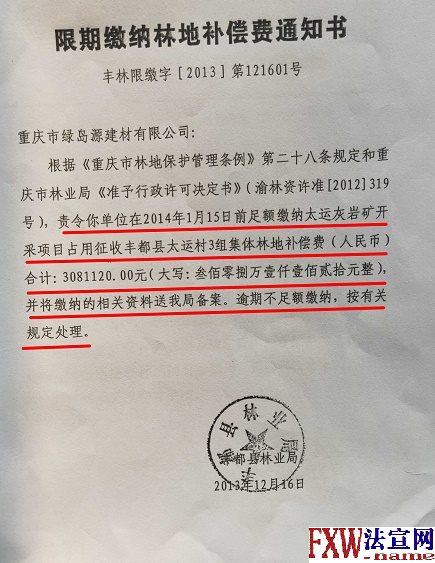 2013年12月16日,丰都县林业局向重庆市绿岛源建材有限公司发出编号为“丰林限缴字【2013】第121601号”《限期缴纳林地补偿费通知书》载明,“责令你单位在2014年1月15日前足额缴纳太运灰岩矿开采项目占用征收丰都县太运村3组集体林地补偿费(人民币)合计:3081120.00元,并将缴纳的相关资料送我局备案。逾期不足额缴纳,按有关规定处理。”