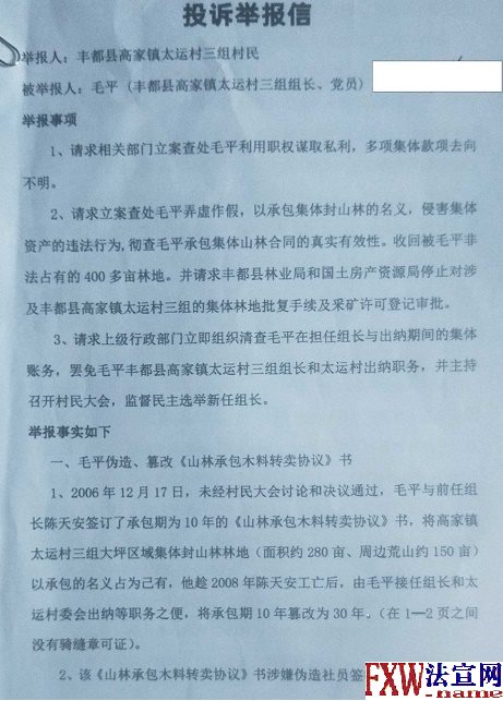 “涪陵法院作出的判决依据的《山林承包合同》签订时间、承包期限及承包总金额完全与我们掌握的《山林承包木料转卖协议》内容一致。所令人震惊的是,涪陵法院竟然将《合同》面积扩大至1250亩,比原合同增加了1000亩面积。”太运村三组村民质疑本案称,按我国《民事诉讼法》规定,这个案子应该由丰都县人民法院管辖,不知为什么毛平舍近求远到涪陵区人民法院起诉不说,且涪陵区法院为什么会未经上级法院指定管辖的情况下违法受理并在立案当天审理、当天便适用普通程序作出判决,且出庭的本组负责人万建根本不是本组组长,而组长实质就是毛平本人。