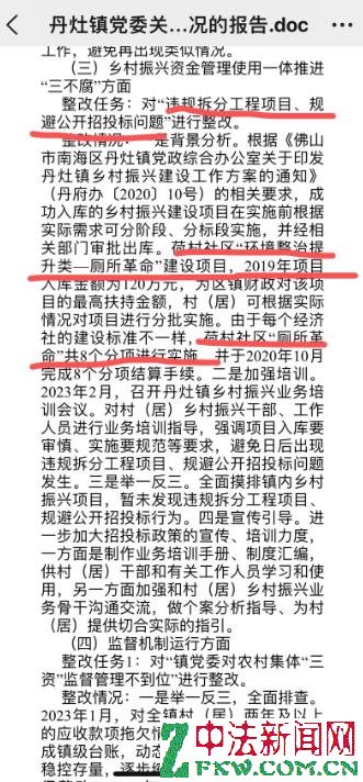 这个“环境整治提升类—厕所”建设项目,是南海区的乡村振兴项目。丹灶镇报告整改第三条写着:全镇乡村振兴项目,也包括建厕所,未发现违规拆分工程项目,规避招投标行为。全镇几十个经济社,都实行招投标,唯独到了荷村徐书记这里,跟钱沾边地球人都知道的招投标猫腻,变成了合规,而且是工程完工一年后,再补的“手续”。这个回复,直接打脸上级党委,这不是整改,这是对贪腐人员的表扬和自我表扬!