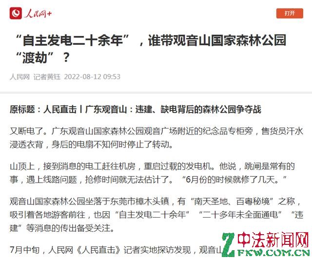 人民网在2022年8月发布的《“自主发电二十余年”,谁带观音山国家森林公园“渡劫”?》