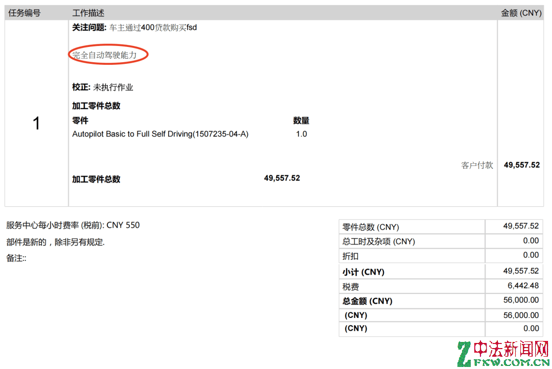 ▲路飞购买特斯拉FSD功能的结算单。受访者供图