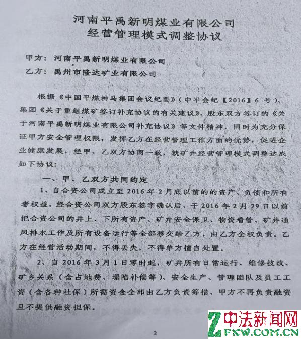 自成立以来,各方签订了一系列协议(包括《合资协议》《增资扩股协议》《经营管理模式调整协议》《安全生产经营协议》等),但在执行中却严重走样:《合资协议》是在禹州市政府见证下签订的,约定是租赁经营,之后他们又避开禹州政府私下签订《增资扩股协议》又改为自有经营,然而之后新明煤业又改为承包经营,任由私企四处圈钱。