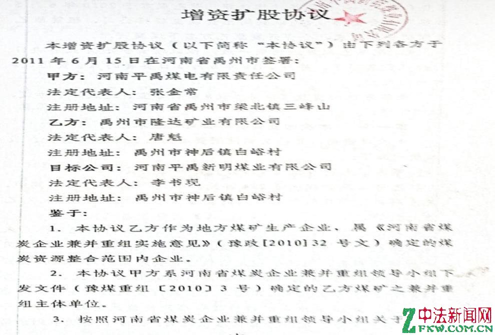 2011年6月15日,双方和目标公司河南平禹新明煤业有限公司签订了《增资扩股协议》,并对合资协议进行了修订。约定甲方平禹煤电出资2907万元、乙方隆达矿业以矿井资产出资2793万元,共同对目标公司平禹新明煤业增资扩股,这样目标公司注册资本为6300万元,其中甲方出资3213万元占股51%,乙方出资3087万元占股49%。