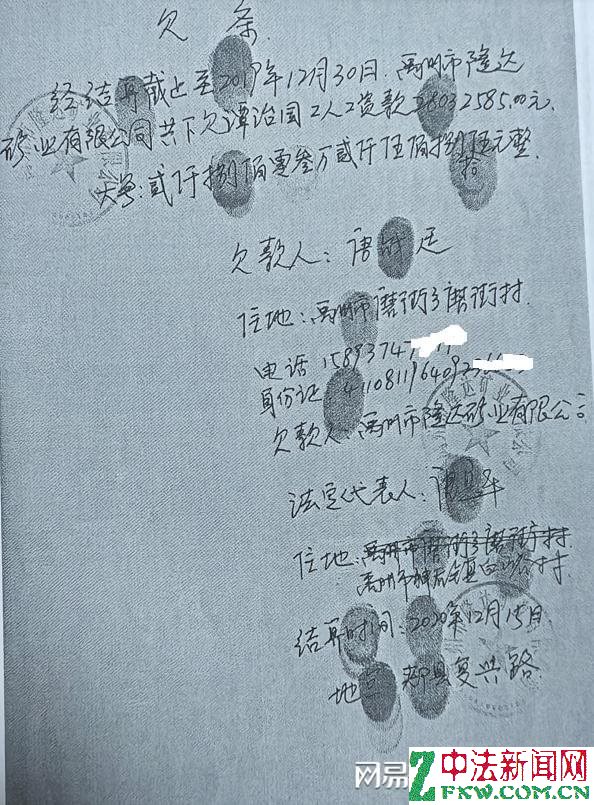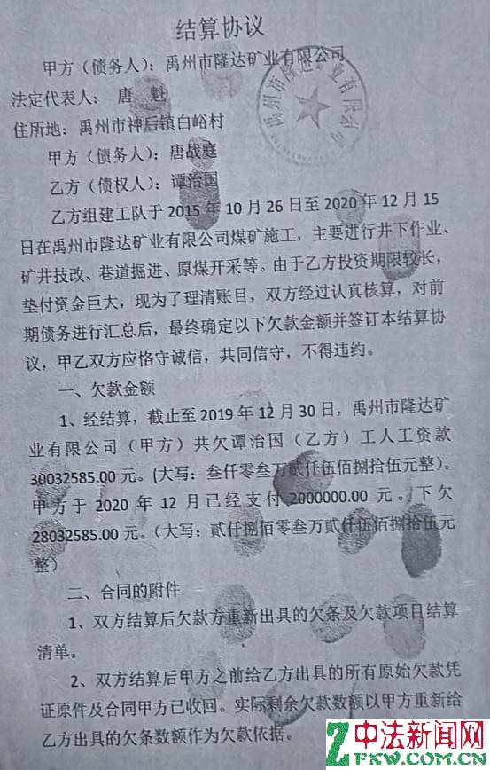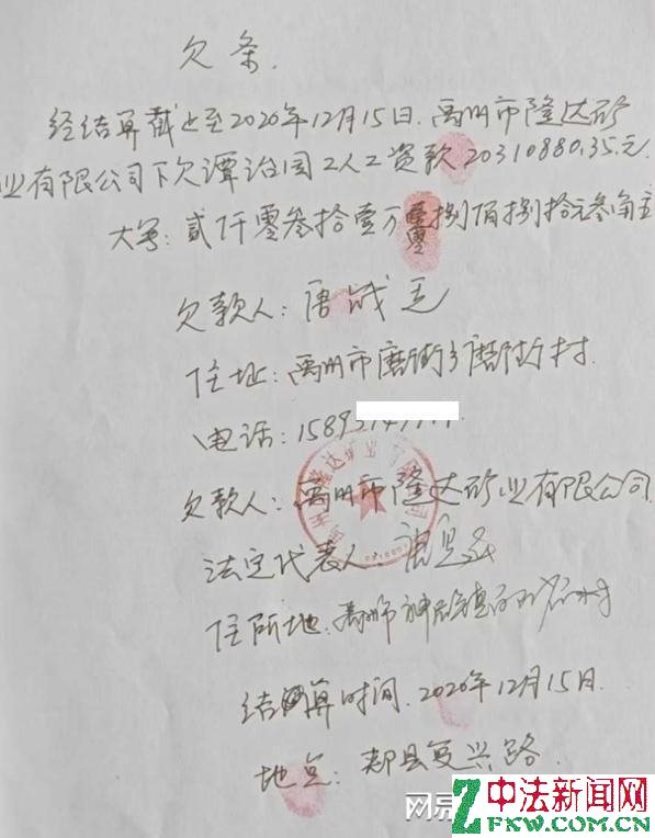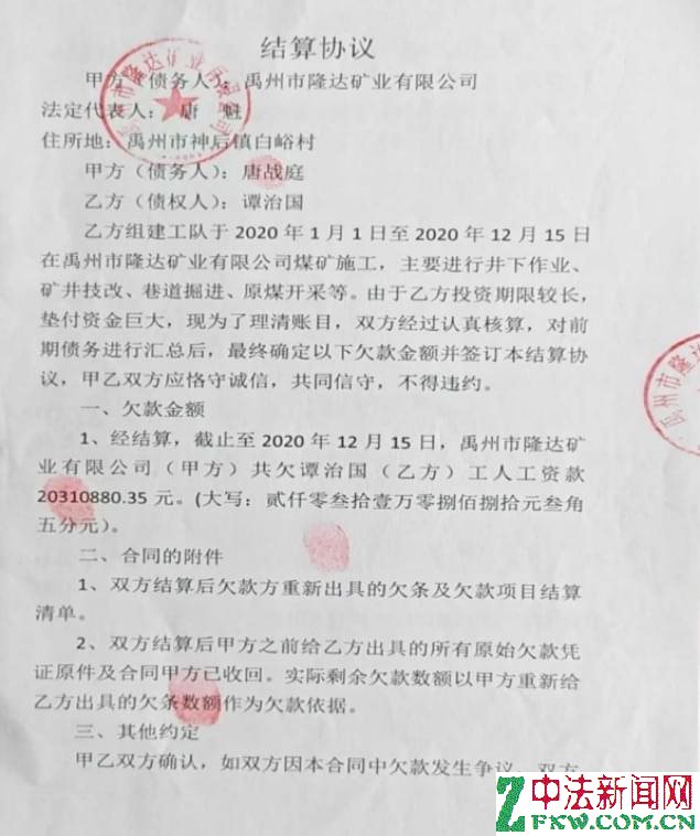 2020年12月15日,隆达矿业公司和实际控制人唐战廷签订结算协议并出具欠条,法人唐魁签字盖章确认2020年1月1日至12月25日,隆达矿业公司欠谭治国工人工资款达2031万零883.5元。