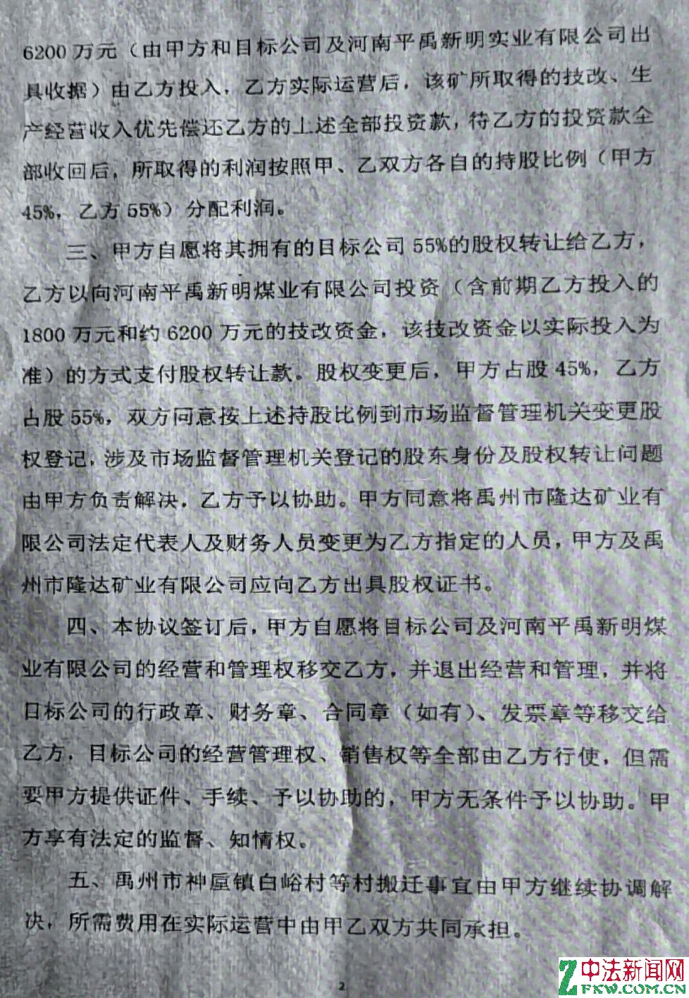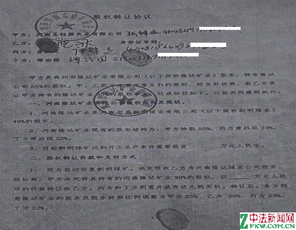 2021年1月25日,唐战廷、谭治国及目标公司隆达矿业公司和乙方张峰杰签订《股权转让协议》,约定乙方自愿向平禹新明煤业公司投入资金1800万元用于偿还隆达矿业及公司股东因筹建、生产经营所欠债务的偿还;乙方进驻煤矿后,平禹新明煤业技改资金约6200万元由乙方投入;甲方自愿将其拥有的目标公司55%股份转让给乙方,乙方以向平禹新明煤业投资的1800万元和6200万元的技改资金的方式支付股权转让款;本协议签订后,甲方自愿将目标公司及平禹新明煤业公司的经营和管理权移交乙方。之后隆达矿业股权变更为河南圣钰源贸易公司占55%,唐战廷占23%,谭治国占22%,法人为张峰杰。也就是说此次股权转让就是圣钰源公司拿出8000万元投资平禹新明煤业公司,谭治国拿出了自己所持有的55%股权转给圣钰源公司。