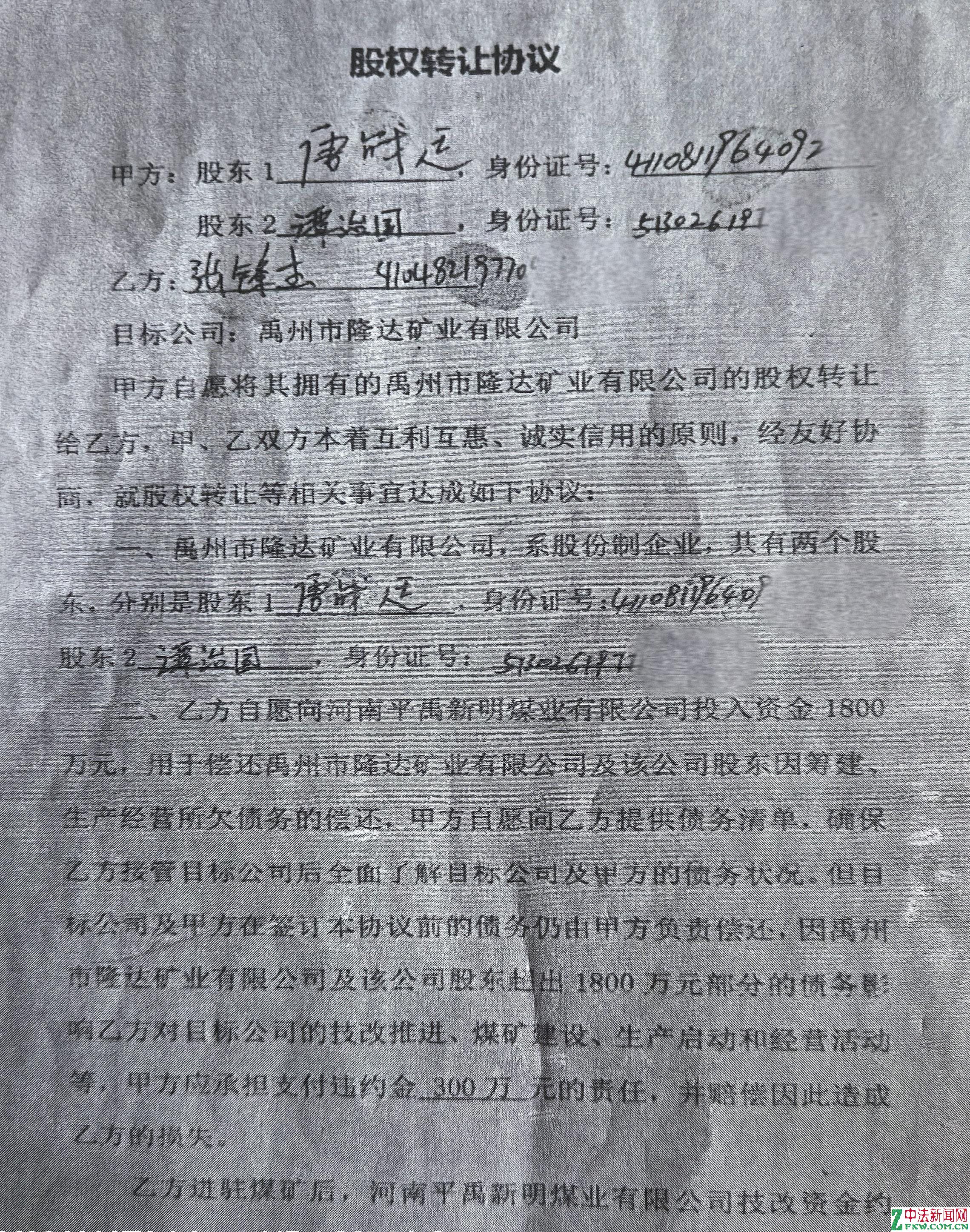 之后甲方圣钰源、乙方杨晓冰、丙方唐战廷、丁方谭治国在2023年8月7日签订的《股权转让协议》显示,为启动恢复新明煤矿决定吸收乙方为隆达矿业公司股东。经协商甲方圣钰源将30%股权转让给乙方,为恢复新明煤矿生产所需资金由乙方投资。协议生效后由乙方负责对煤矿的生产、销售、技术、安全实施全面管理。