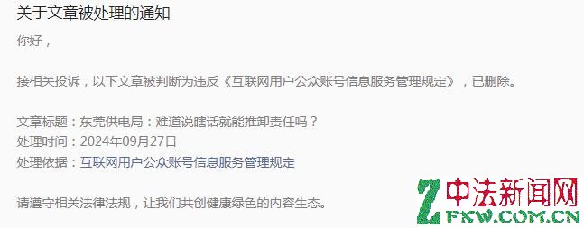 同时,公众号文章《东莞供电局:难道说瞎话就能推卸责任吗?》被投诉删除