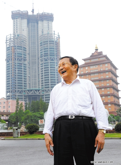 2009年8月12日,吴仁宝在华西村幸福园与村民交谈。他的身后是当时正在建设的“华西增地空中新农村大楼”。 新华社记者 孙参 摄